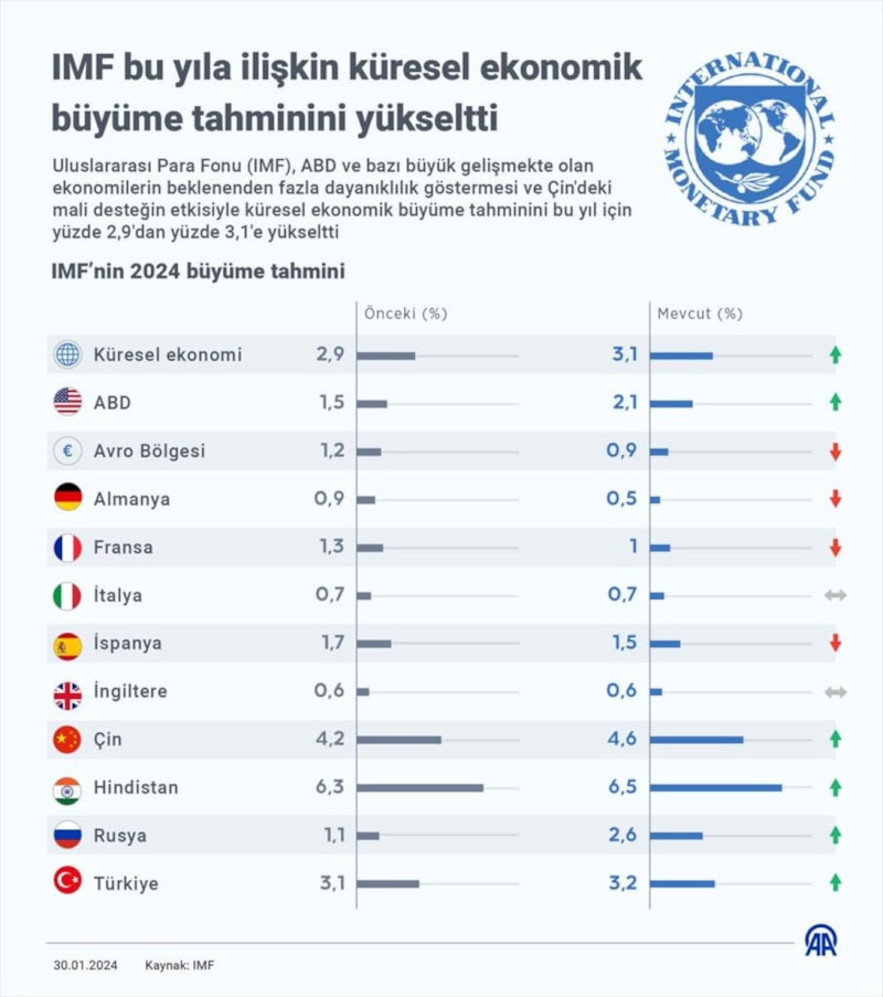 IMF, Dünya Ekonomik Görünüm Raporu'nda Türkiye için 2024 yılı büyüme beklentisini yüzde 3,1'e çıkardı. IMF, ayrıca 2024 yılı küresel büyüme tahminini de yukarı yönlü revize etti.