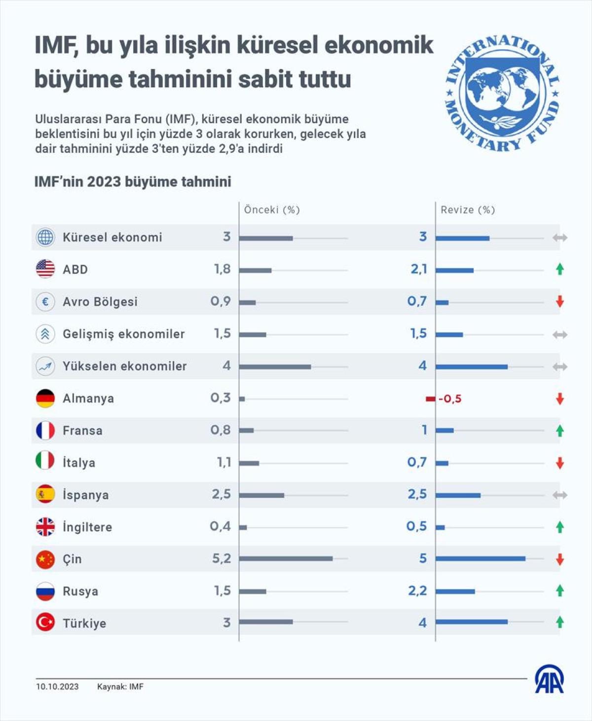 IMF daha önce yayınladığı Dünya Ekonomik Görünüm raporunda Türkiye'nin 2023 yılı büyüme tahminini 0,3 puan artırarak yüzde 3'e yükseltirken 2024 büyüme tahmini yüzde 2,8'e düşürmüştü.