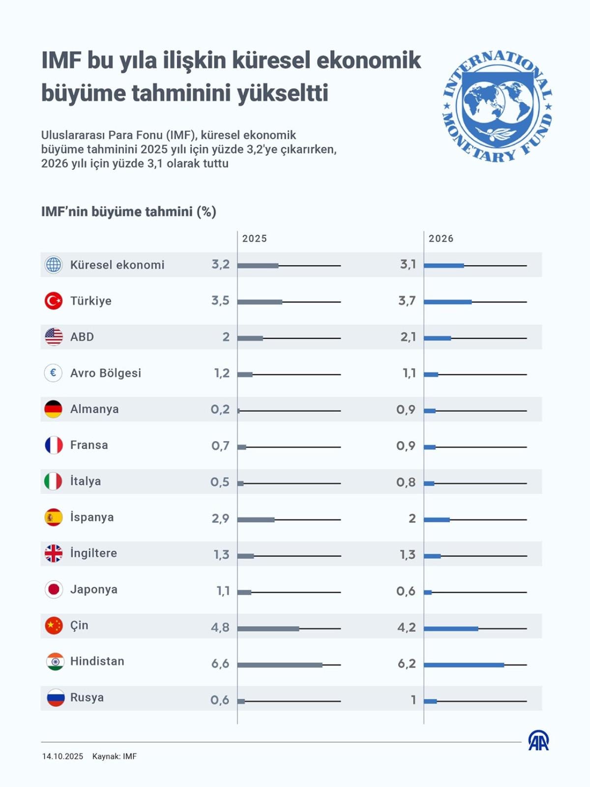 IMF'nin ekim ayı Global Ekonomik Görünüm Raporu'na göre 2026 için yüzde 3,3'ten yüzde 3,7'ye yükseltildi.
