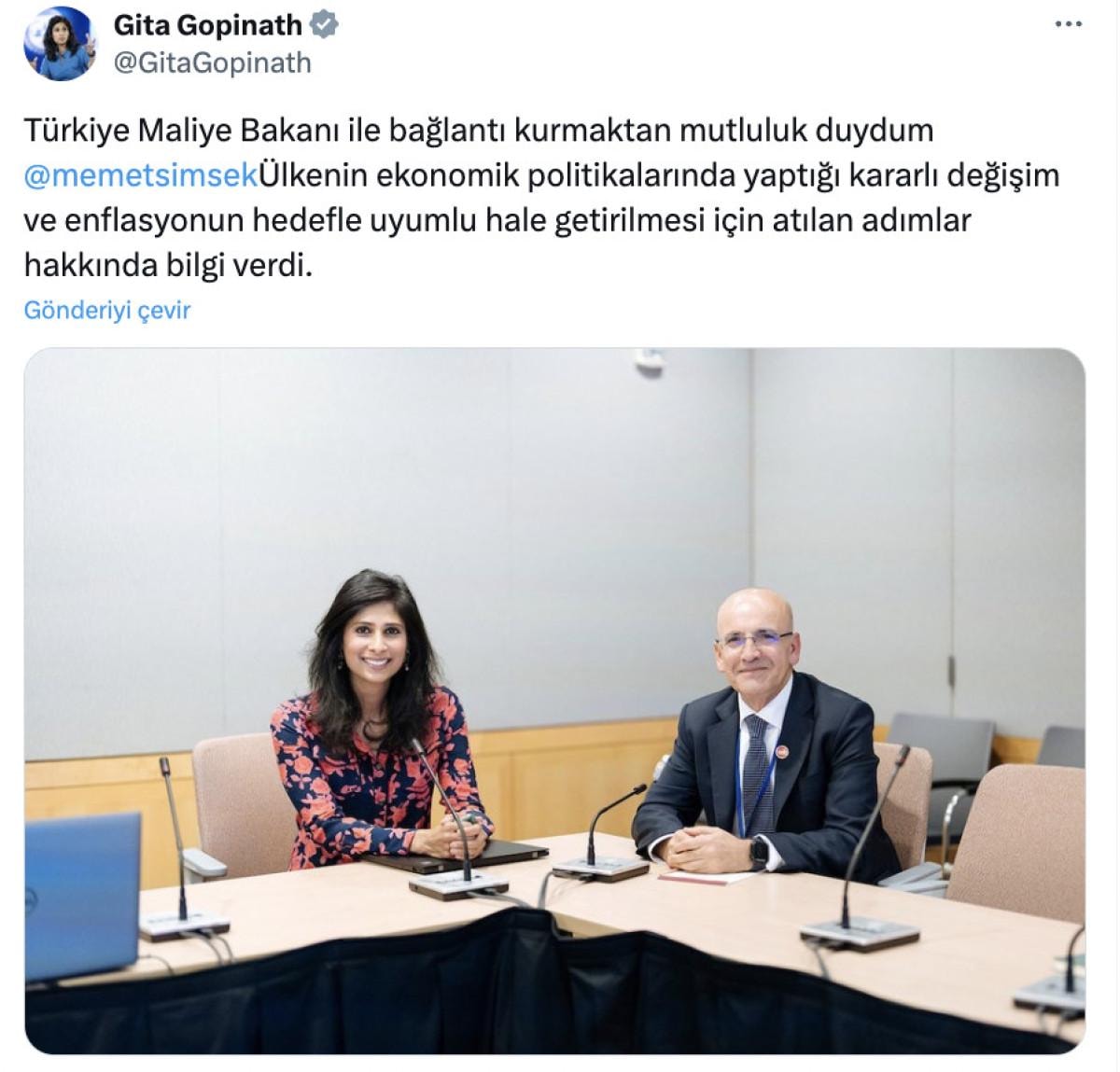 Gita Gopinath, Bakan Şimşek ile yaptığı görüşmeye dair X paylaşımında şu ifadeleri kullandı: