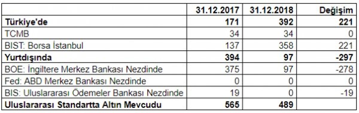 2017'de bu altınların 394 tonu yurt dışındayken, 2018'de ise altın stoğumuzun 97 tonu yurt dışında yer aldı.