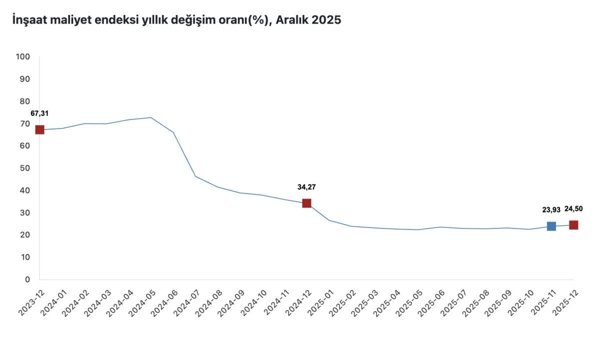 - İnşaat maliyet endeksi Aralık 2025'te bir önceki aya göre yüzde 1,17, yıllık bazda yüzde 24,5 arttı.