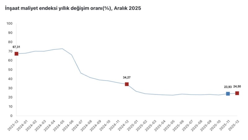 İnşaat maliyet endeksi, 2025 yılı Aralık ayında bir önceki aya göre yüzde 1,17, bir önceki yılın aynı ayına göre yüzde 24,50, bir önceki aya göre malzeme endeksi yüzde 1,22, işçilik endeksi yüzde 1,06 yükseldi.