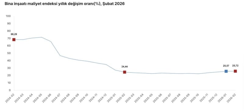 İnşaat maliyet endeksi 2026 yılı Şubat ayında, bir önceki aya göre yüzde 1,51 arttı, bir önceki yılın aynı ayına göre yüzde 25,72 arttı. Bir önceki aya göre malzeme endeksi yüzde 2,33 arttı, işçilik endeksi yüzde 0,20 arttı. Ayrıca bir önceki yılın aynı ayına göre malzeme endeksi yüzde 23,73 arttı, işçilik endeksi yüzde 29,12 arttı.