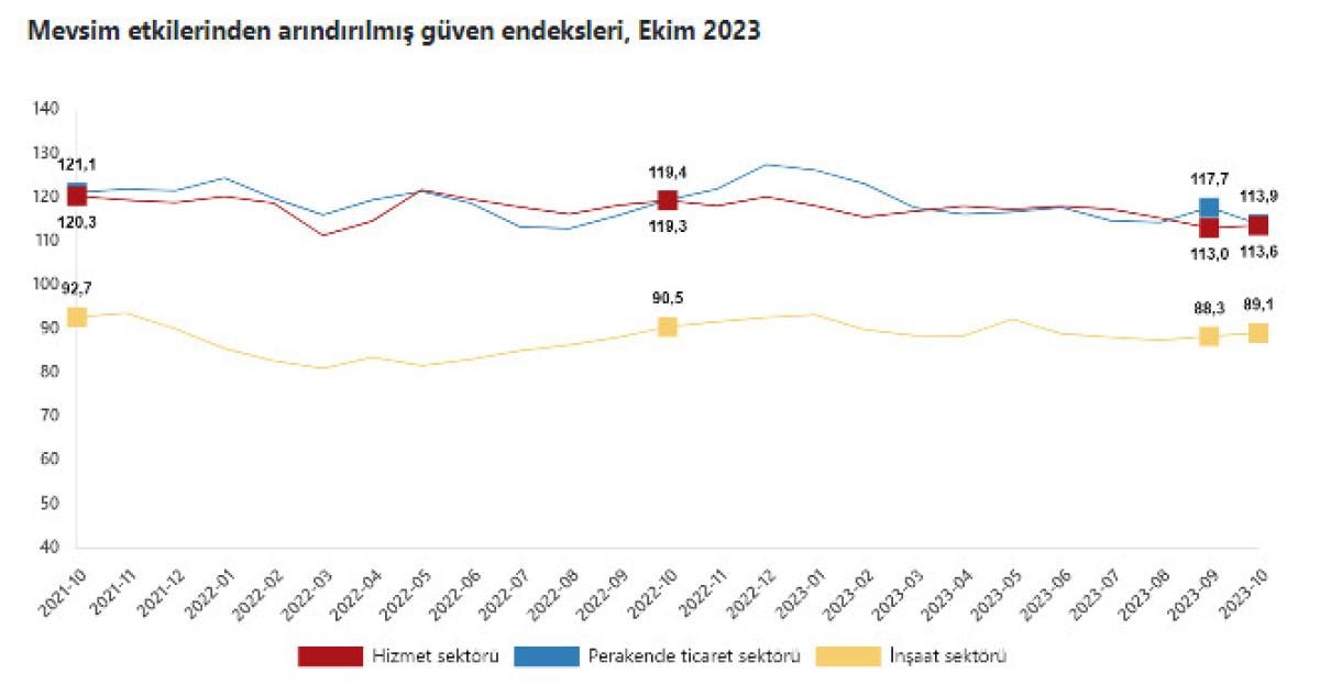 Mevsim etkilerinden arındırılmış güven endeksi ekim ayında, bir önceki aya göre hizmet sektöründe yüzde 0,5 oranında artarak 113,6 değerini, perakende ticaret sektöründe yüzde 3,3 oranında azalarak 113,9 değerini ve inşaat sektöründe yüzde 0,9 oranında artarak 89,1 değerini aldı.