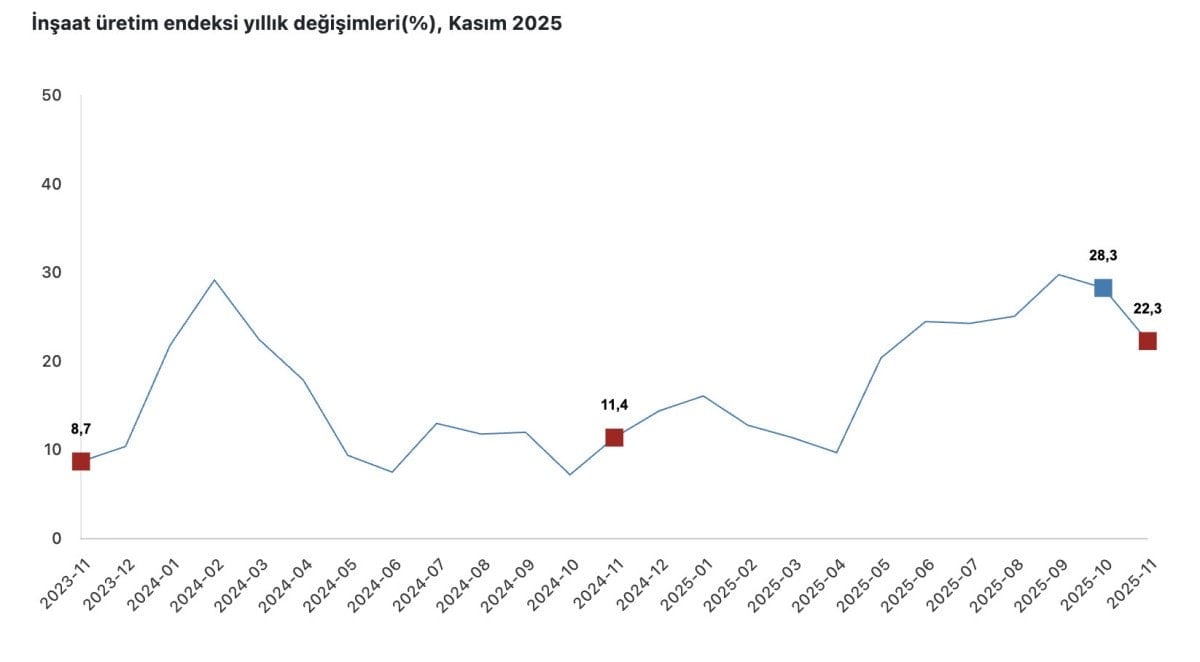 - Türkiye'de inşaat üretimi 2025 Kasım'da yıllık yüzde 22,3 arttı.