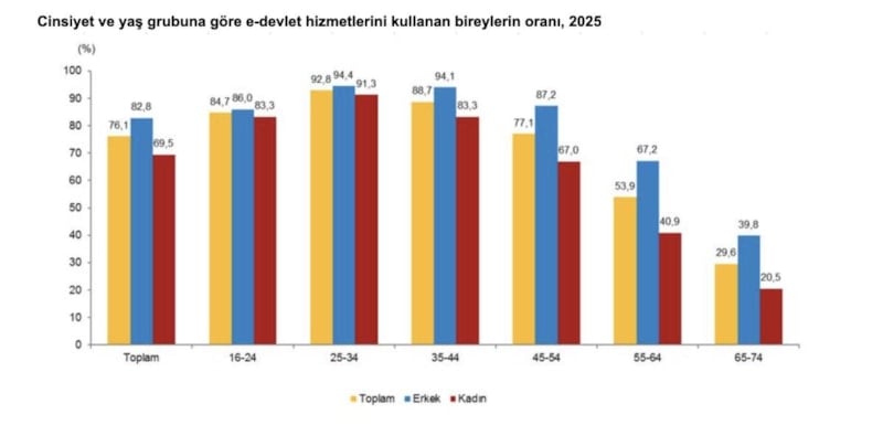 E-devlet hizmetlerini kullanan bireylerin oranı yaş grubuna göre incelendiğinde ise bu oranın en yüksek yüzde 92,8 ile 25-34 yaş grubunda, en düşük yüzde 29,6 ile 65-74 yaş grubunda olduğu görüldü.