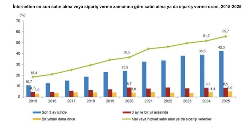 Bu oran, en son mal veya hizmet satın alma ya da sipariş verme zamanlarına göre incelendiğinde; bireylerin yüzde 42,3'ünün son 3 ay içinde (2025 yılı ilk 3 ayı) mal veya hizmet satın aldığı ya da sipariş verdiği görüldü.