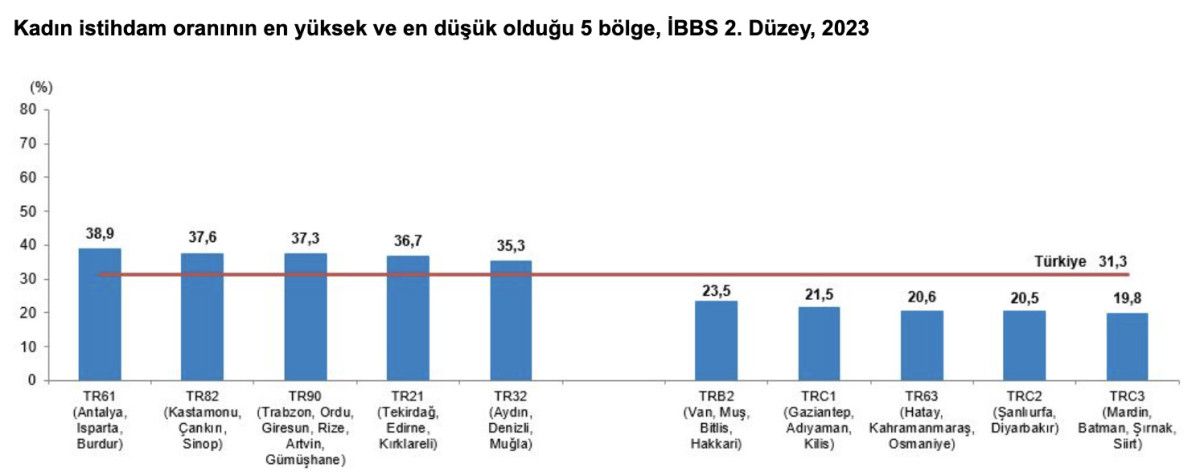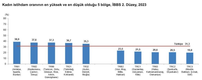 En yüksek kadın istihdam oranı, yüzde 38,9 ile TR61 (Antalya, Isparta, Burdur) bölgesinde, en düşük kadın istihdam oranı ise yüzde 19,8 ile TRC3 (Mardin, Batman, Şırnak, Siirt) bölgesinde gerçekleşti.
