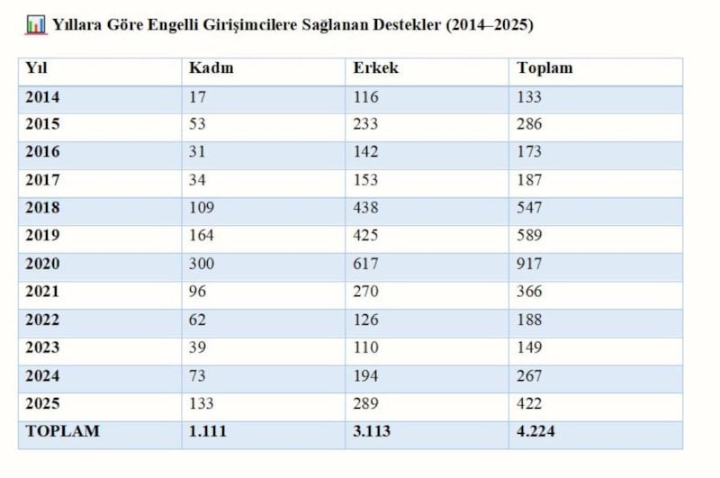 2014 yılından bugüne kadar 4 bin 224 engelli girişimci projesi desteklendi. Bu projelerin 1.111'i kadın engelliler tarafından hazırlandı. Bu durum engelli kadınların girişimcilik alanındaki artan rolünü gösteriyor.