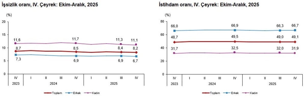 - İşsizlik oranı 2025'in dördüncü çeyreğinde yüzde 8,2'ye düşerek geçen çeyreğe göre 0,2 puan azaldı.