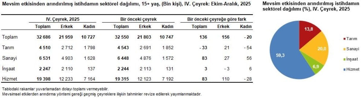 Mevsim etkisinden arındırılmış istihdam edilenlerin sayısı 2025 yılı dördüncü çeyreğinde, bir önceki çeyreğe göre tarım sektöründe 33 bin kişi azalırken sanayi sektöründe 83 bin kişi, inşaat sektöründe 3 bin kişi, hizmet sektöründe 83 bin kişi arttı.