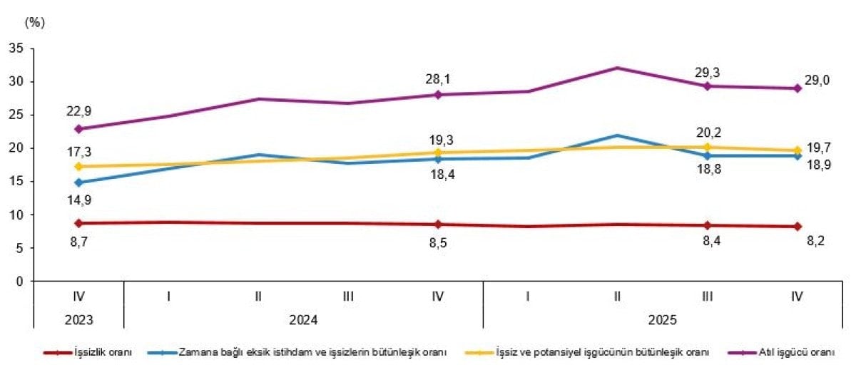 Zamana bağlı eksik istihdam, potansiyel iş gücü ve işsizlerden oluşan atıl iş gücü oranı 2025 yılı dördüncü çeyreğinde bir önceki çeyreğe göre 0,3 puanlık azalış ile yüzde 29,0 oldu.