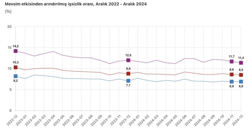 TÜİK, aralık istihdam ve işsizlik verilerine paylaştı. Mevsim etkisinden arındırılmış işsizlik oranı 0,1 puan azalarak yüzde 8,5 seviyesinde gerçekleşti.