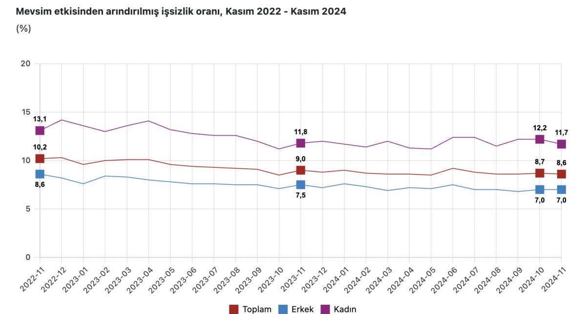 Mevsim etkisinden arındırılmış işsizlik oranı, en son ekim ayında yüzde 8,8 seviyesinde gerçekleşmişti.