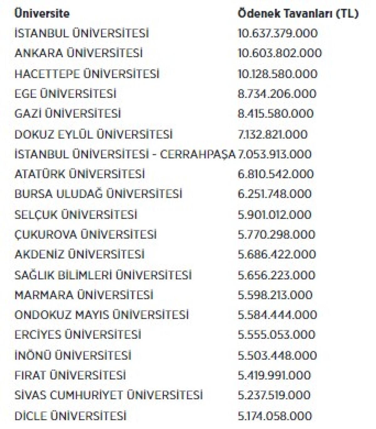 Bunu 10 milyar 128 milyon 580 bin lirayla Hacettepe Üniversitesi, 8 milyar 734 milyon 206 bin lirayla Ege Üniversitesi ve 8 milyar 415 milyon 580 bin lirayla Gazi Üniversitesi izledi.