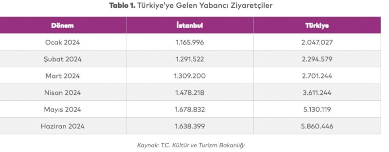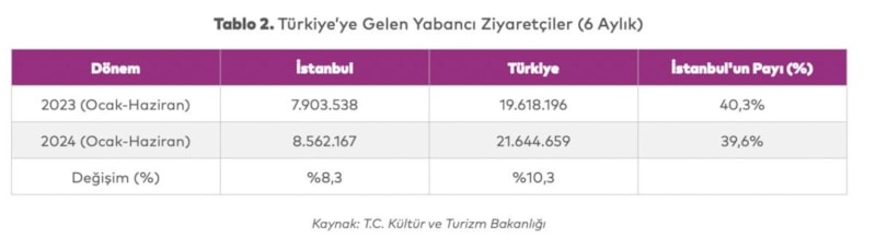 2024 yılının ilk altı ayında İstanbul’a gelen turist sayısı 8 milyon 562 bin 167 oldu. 2024 yılının ilk altı ayında İstanbul’un Türkiye içerisindeki payı yüzde 39,6 olarak kayıtlara geçti.