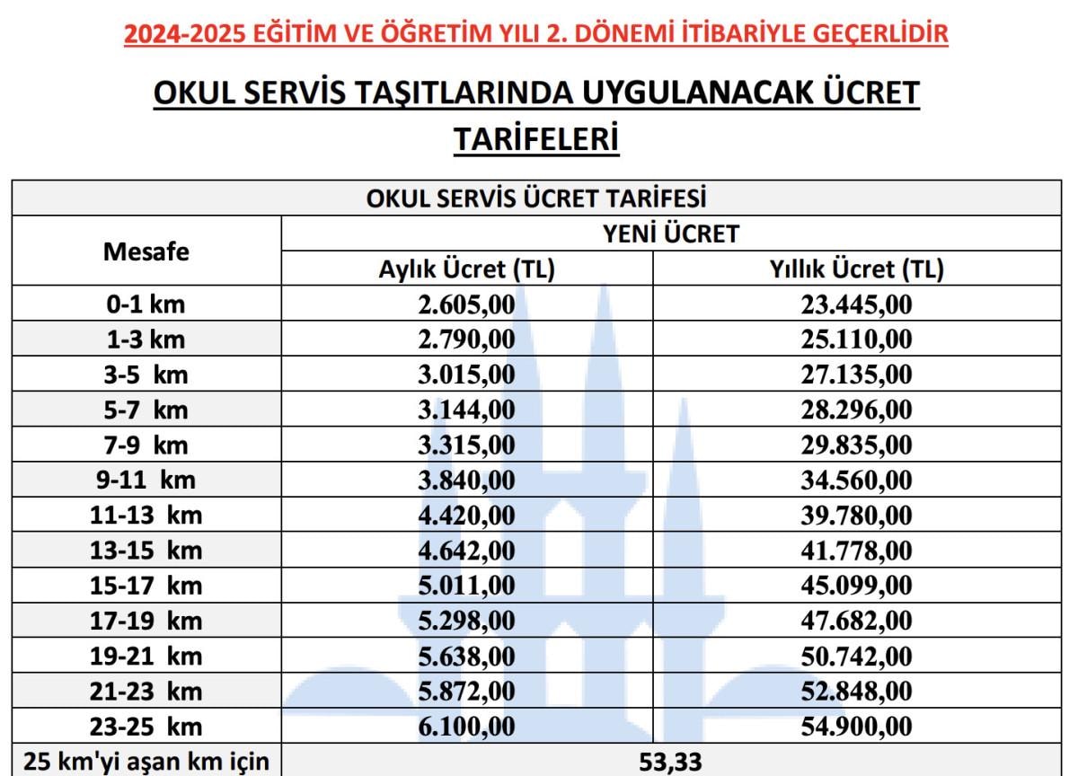 2024-2025 EĞİTİM-ÖĞRETİM YILI OKUL SERVİSİ ÜCRETLERİ
