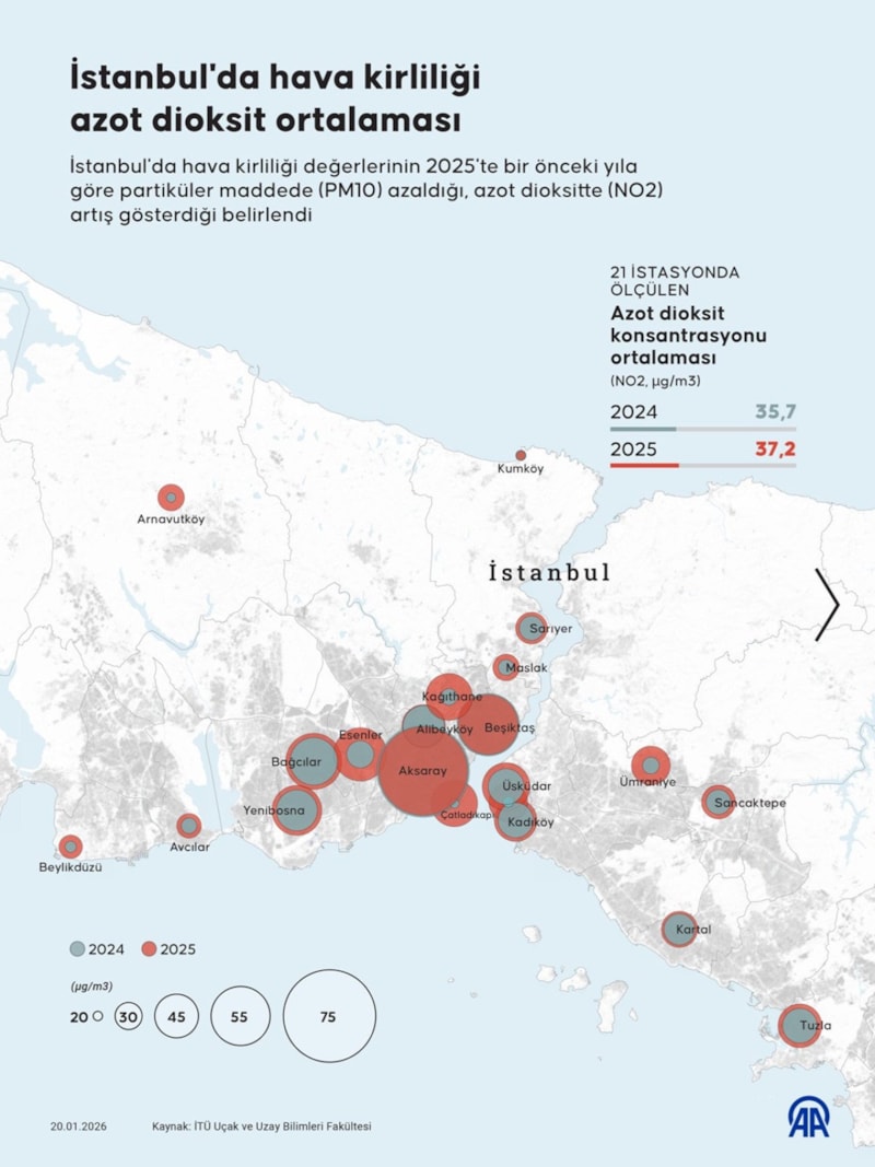 İstanbul'da 2025'te azot dioksit hava kirliliğinin en fazla ölçüldüğü istasyon, metreküp başına 74,9 mikrogramla Aksaray oldu. Aksaray İstasyonu'nu 51 mikrogramla Beşiktaş ve 48 mikrogramla Bağcılar takip etti.