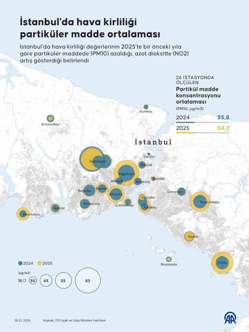 İstanbul Teknik Üniversitesi (İTÜ) bünyesinde yapılan çalışmada, İstanbul'da hava kirliliği değerlerinin 2025'te, bir önceki yıla göre partiküler maddede (PM10) azaldığı, azot dioksitte (NO2) artış gösterdiği belirlendi.