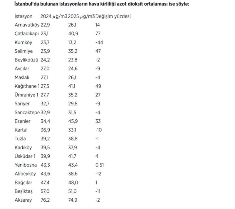 İstanbul'da azot dioksit hava kirliliği oranı 9 istasyonda arttı, 12 istasyonda azaldı.