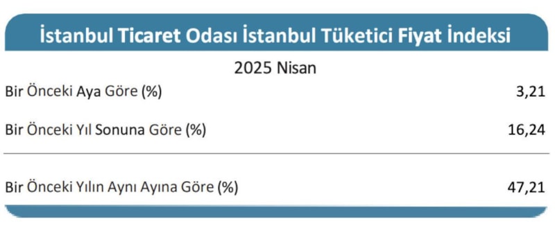 2025 Nisan ayı İTO istanbul tüketici fiyat indeksi yayınlandı. Buna göre İstanbul'un enflasyonu nisanda aylık 3,21 olurken, yıllık ise yüzde 47,21'e ulaştı.