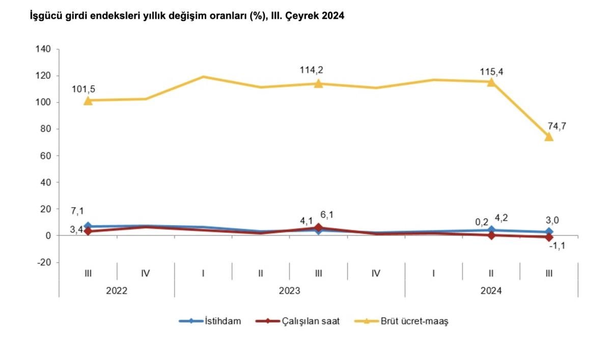 Sanayi, inşaat ve ticaret-hizmet sektörleri toplamında brüt ücret-maaş endeksi, 2024 yılı üçüncü çeyreğinde bir önceki yılın aynı çeyreğine göre yüzde 74,7 arttı. Alt sektörler incelendiğinde, endeks; sanayi sektöründe yüzde 73,9, inşaat sektöründe yüzde 73,9 ve ticaret-hizmet sektörlerinde yüzde 75,2 arttı.