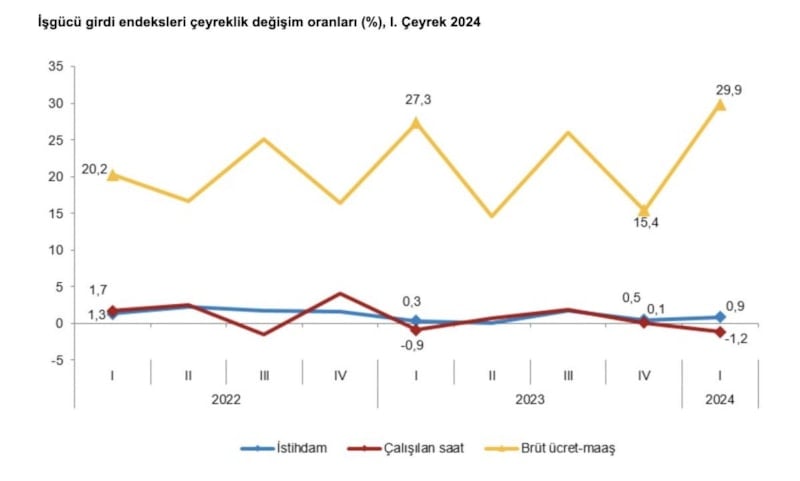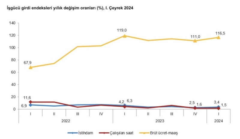 2024'ün ilk çeyreğine ilişkin iş gücü istatistikleri paylaşıldı. Buna göre çalışılan saat endeksi yıllık yüzde 1,5 arttı ve brüt ücret-maaş endeksi yıllık yüzde 116,5 yükseldi.