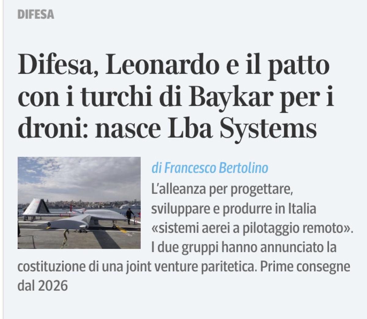 Ülkenin yüksek tirajlı gazetelerinden Corriere della Sera gazetesi, "Leonardo'nun Türk Baykar ile İHA anlaşması" başlığıyla verdiği haberinde, mart ayında mutabakat zaptı imzalayan iki şirketin dün yüzde 50 ortaklıkla LBA System isimli ortak girişimi kurduğu ve Leonardo ile Baykar'ın İtalya'da İHA üretmek için bir araya geldiği belirtildi.