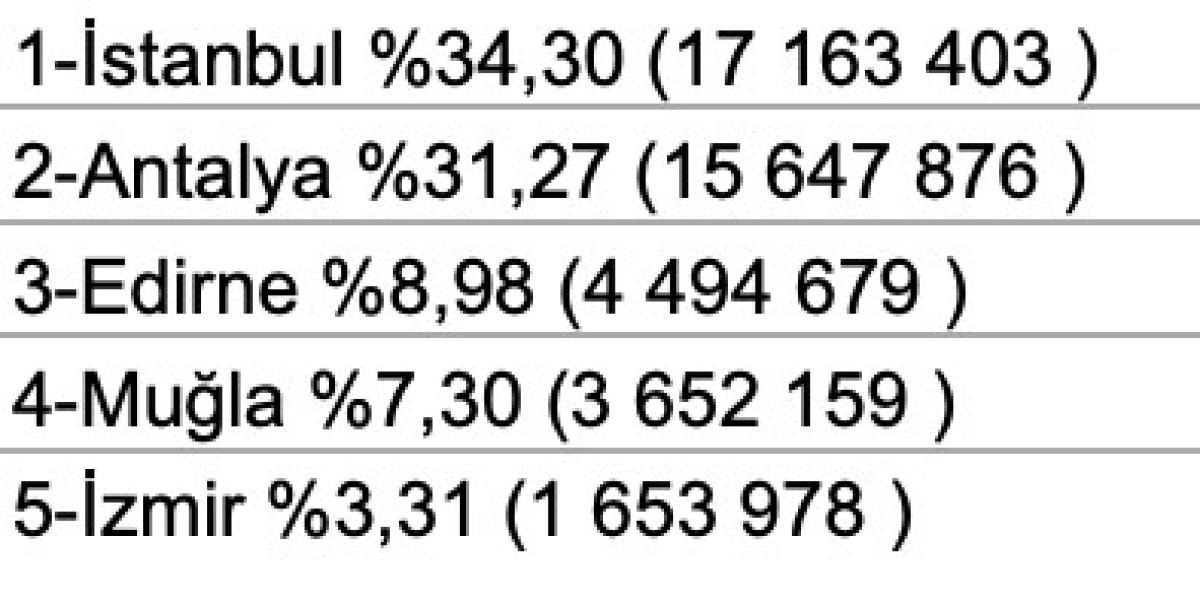 Ocak-Ekim döneminde Ülkemize gelen yabancı ziyaretçilerin en çok giriş yaptıkları sınır kapılarının bağlı olduğu iller sıralamasında ilk 5 il aşağıdaki şekilde gerçekleşti.