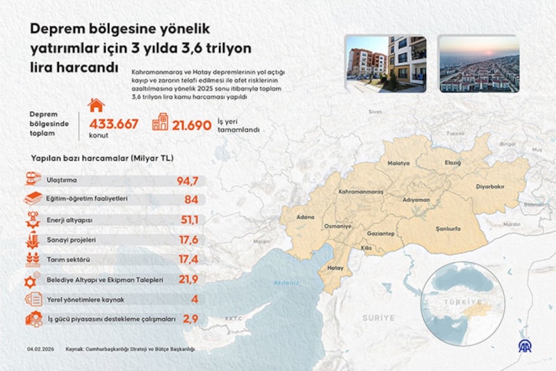 Felaketin neden olduğu kayıp ve zararın telafi edilmesine ilişkin 2023-2025 döneminde toplam 3,6 trilyon lira harcama yapıldığına işaret edilen açıklamada, 2026 yılı bütçesinde toplam 653 milyar liralık kaynağın bölgedeki ihtiyaç ve hasarların giderilmesi için ayrıldığı vurgulandı.