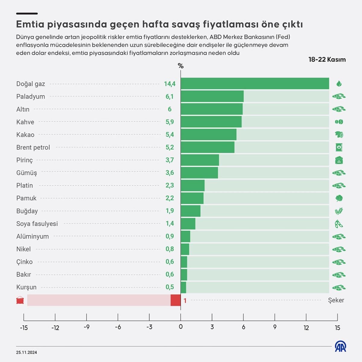 Dünya genelinde artan jeopolitik riskler emtia fiyatlarını desteklerken, ABD Merkez Bankası'nın (Fed) enflasyonla mücadelesinin beklenenden uzun sürebileceğine dair endişeler ile güçlenmeye devam eden dolar endeksi, emtia piyasasındaki fiyatlamaların zorlaşmasına neden oldu.