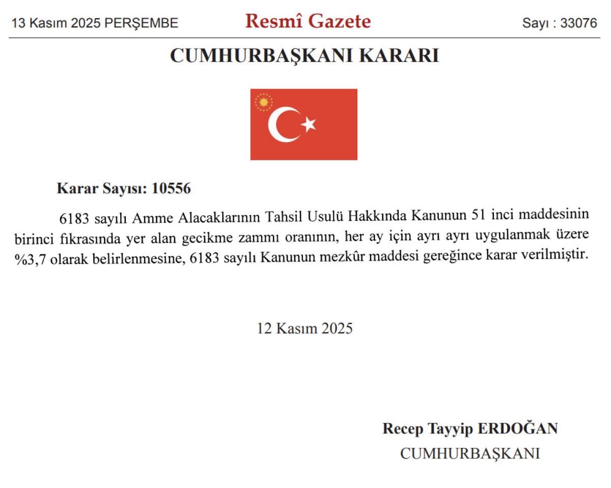 Cumhurbaşkanı kararıyla Resmi Gazete'de yayımlanan karara göre, Amme Alacaklarının Tahsil Usulü Hakkında Kanunu'nda yer alan gecikme zammı oranı belirlendi.