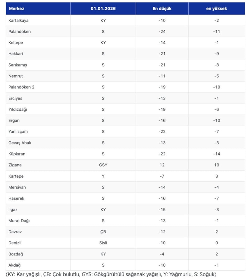 Bazı kayak merkezlerinde en düşük ve en yüksek hava sıcaklık tahminleri ise şöyle: