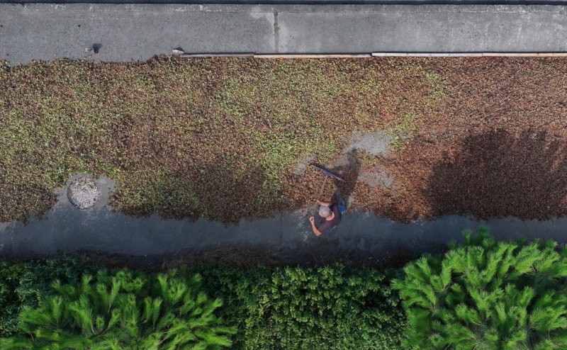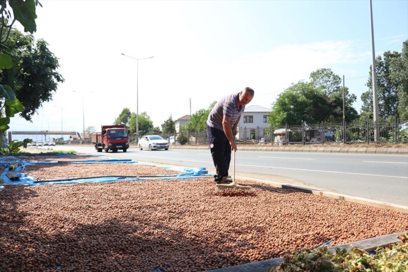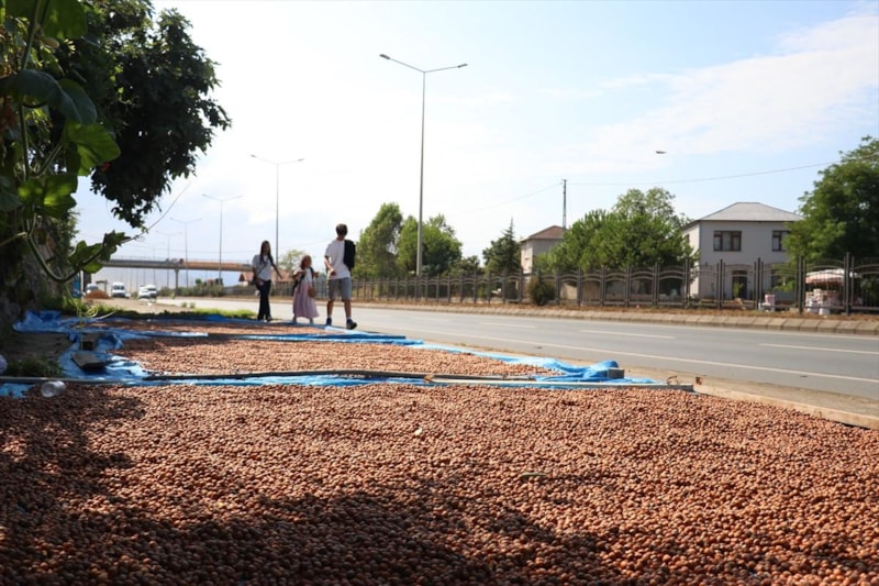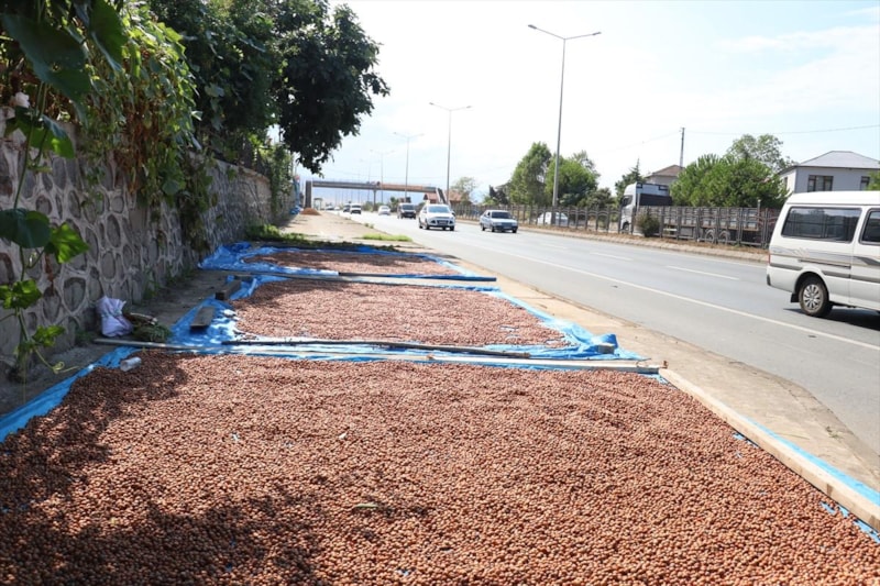 Trabzon'da hasat sonrası çuvallarla topladıkları ürünlerini kurutmak zorunda olan bazı üreticiler, düz bir zemin arayışına Karadeniz Sahil Yolu'ndaki kaldırımlarda çözüm buldu.
