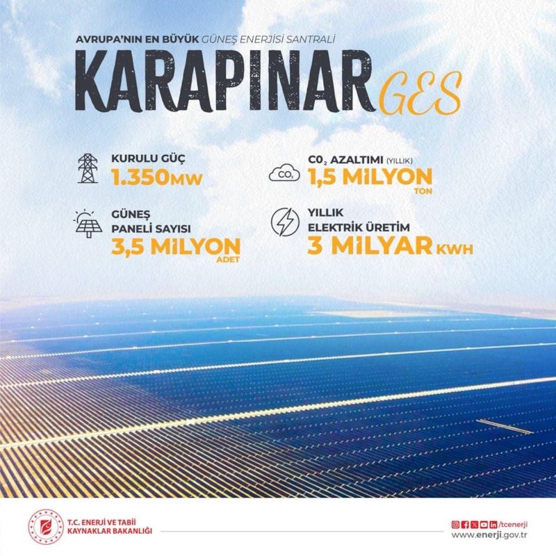 Enerji ve Tabii Kaynaklar Bakanlığı, sosyal medya paylaşımında Karapınar Güneş Enerjisi Santrali'nin Avrupa’nın en büyük güneş enerjisi santrali olduğunu bildirdi.