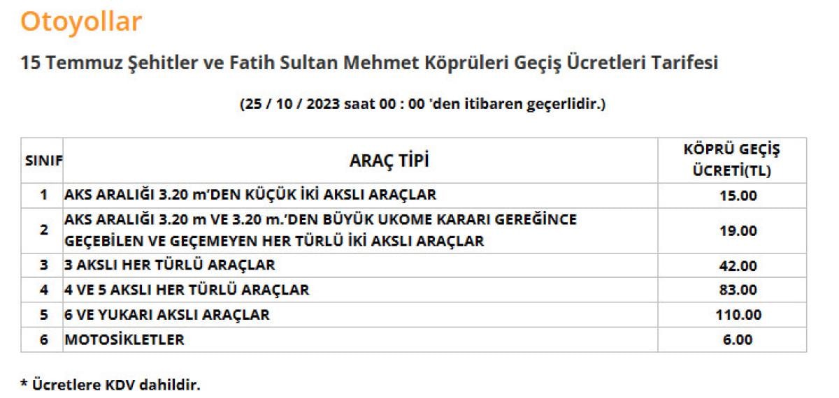 Karayolları Genel Müdürlüğü, "Otoyol ve köprü ücretleri, 25 Ekim 2023 Çarşamba günü saat 00.00’dan itibaren geçerli olmak üzere yeniden düzenlenmiştir" açıklamasıyla ücretlere zam geldiğini duyurdu.