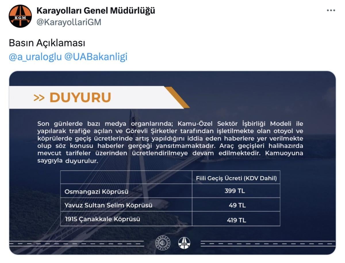 Karayolları Genel Müdürlüğü, bu iddianın doğru olmadığını bildirerek şu duyuruyu yaptı: