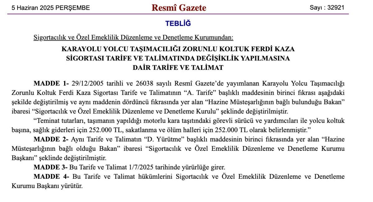 Sigortacılık ve Özel Emeklilik Düzenleme ve Denetleme Kurumu'ndan (SEDDK), Karayolu Yolcu Taşımacılığı Zorunlu Koltuk Ferdi Kaza Sigortası Tarife ve Talimatında Değişiklik Yapılmasına Dair Tarife ve Talimat, dünkü Resmi Gazete'de yayımlandı.
