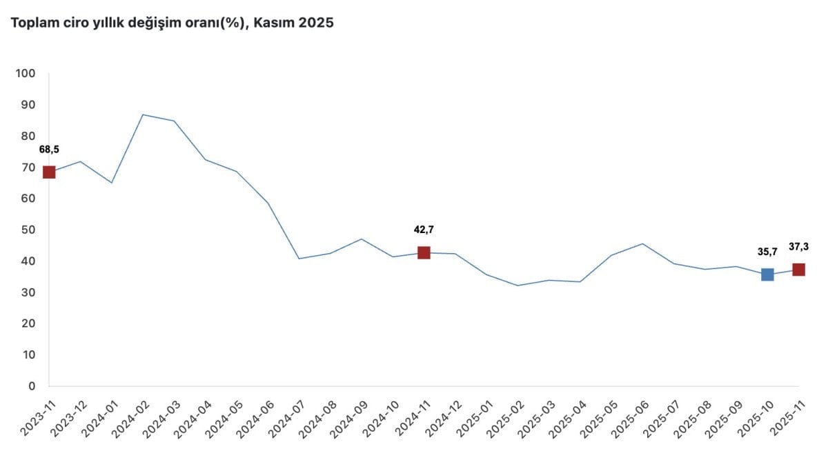 - Kasım 2025'te sektörlerin ciro endeksi yıllık bazda yüzde 37,3 arttı.