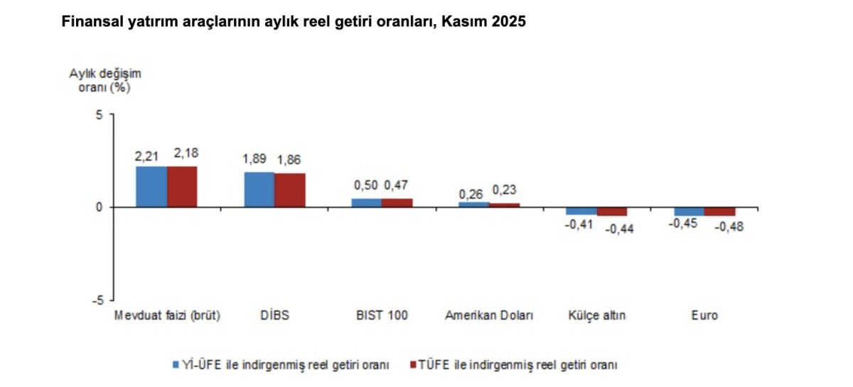 Türkiye İstatistik Kurumu (TÜİK) verilerine göre, Tüketici Fiyat Endeksi (TÜFE) ile indirgendiğinde, kasımda en yüksek aylık reel getiri yüzde 2,18 ile mevduat faizinde (brüt) gerçekleşti.