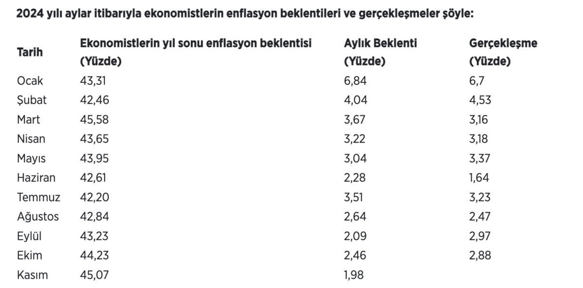 Öte yandan, ekonomistlerin 2024 sonu enflasyon beklentisi kasımda yüzde 45,07 oldu.