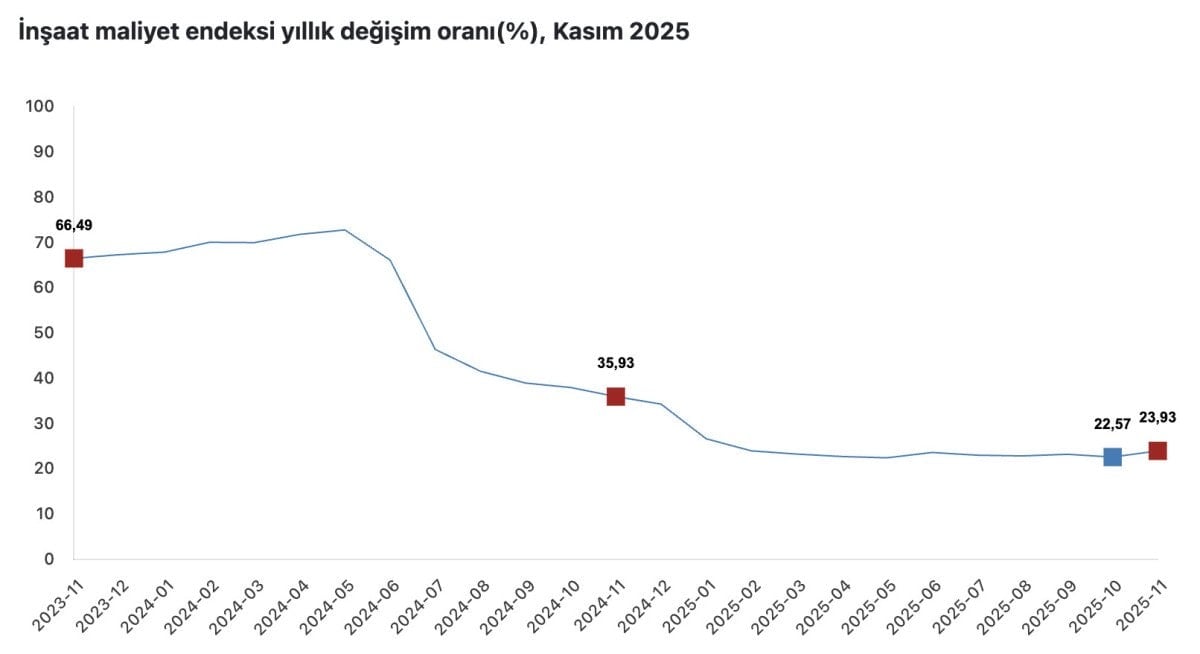 - İnşaat maliyet endeksi Kasım 2025'te aylık %1,14, yıllık %23,93 arttı.