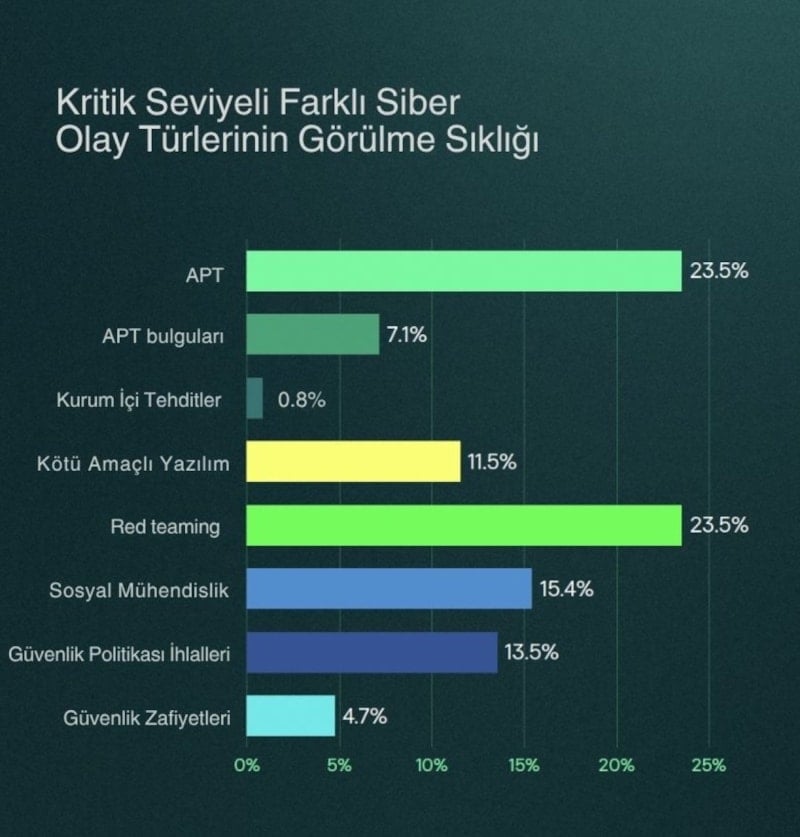 Sosyal mühendislik saldırıları ise üçüncü sırada yer alarak kritik seviyedeki siber olayların yüzde 15’inden fazlasını oluşturdu ve kurumların yaklaşık yüzde 18’ini etkiledi. Bu tür saldırılar, başarılı olup otomatik olarak engellenemediğinde kritik seviyede sınıflandırılıyor ve çoğunlukla kullanıcı farkındalığını artırmaya yönelik önerilerle sonuçlanıyor.