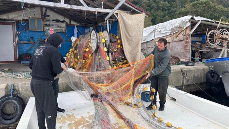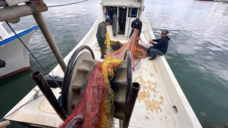 Şehit Ömer Şenel Balıkçı Barınağı'nda hava koşullarının iyileşmesini bekleyen balıkçılar, teknelerinin bakımlarını yaparak palamut avında kullanacakları ağları teknelerine yükledi.