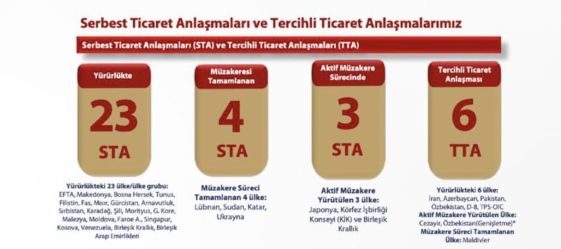 Ticaret Bakanlığı'nın verdiği bilgilere göre, Türkiye olarak, bugüne kadar Avrupa Birliği (AB) ile Gümrük Birliği dışında, 23 ülke ile Serbest Ticaret Anlaşması, 6 ülke ile Tercihli Ticaret Anlaşmaları daha önce imzalanmış olup, yürürlükte bulunuyor.