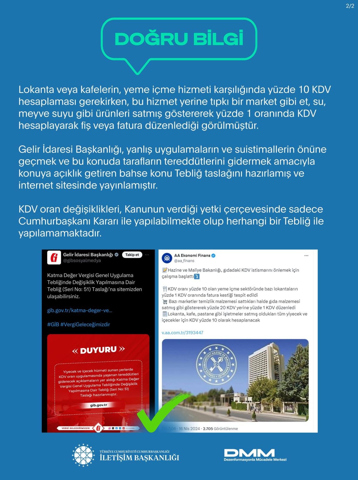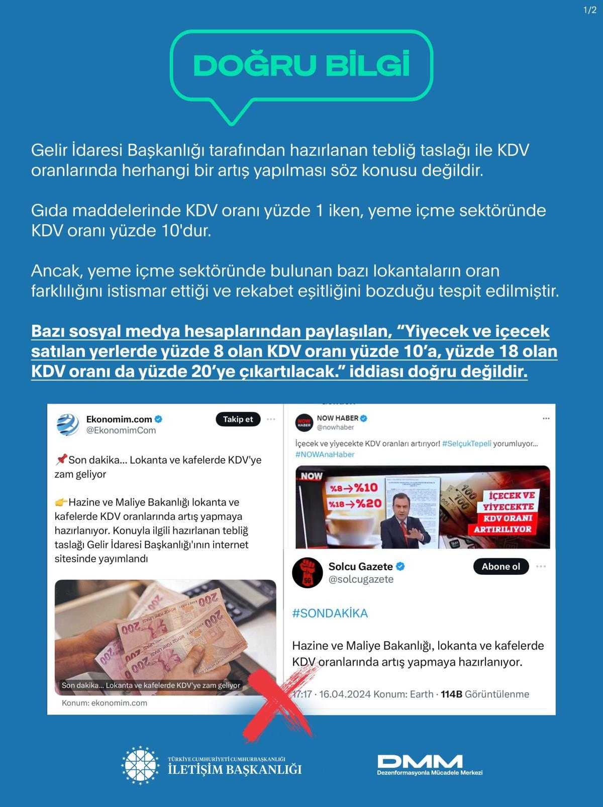 Bazı sosyal medya hesaplarından paylaşılan, “Yiyecek ve içecek satılan yerlerde yüzde 8 olan KDV oranı yüzde 10’a, yüzde 18 olan KDV oranı da yüzde 20’ye çıkartılacak.” iddiası doğru değildir.