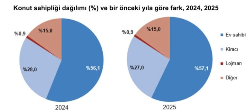 Oturulan konuta sahip olanların oranı geçen yıla göre 1 puan artarak 2025 yılında yüzde 57,1 olarak hesaplanırken, kirada oturanların oranı yüzde 27, lojmanda oturanların oranı yüzde 0,9, kendi konutunda oturmayıp kira ödemeyenlerin oranı ise yüzde 15 oldu.