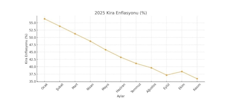 2025 boyunca kira enflasyonu düştü (artış hızı yavaşladı), ama kira fiyatları birikimli şekilde arttığı için hala yüksek.