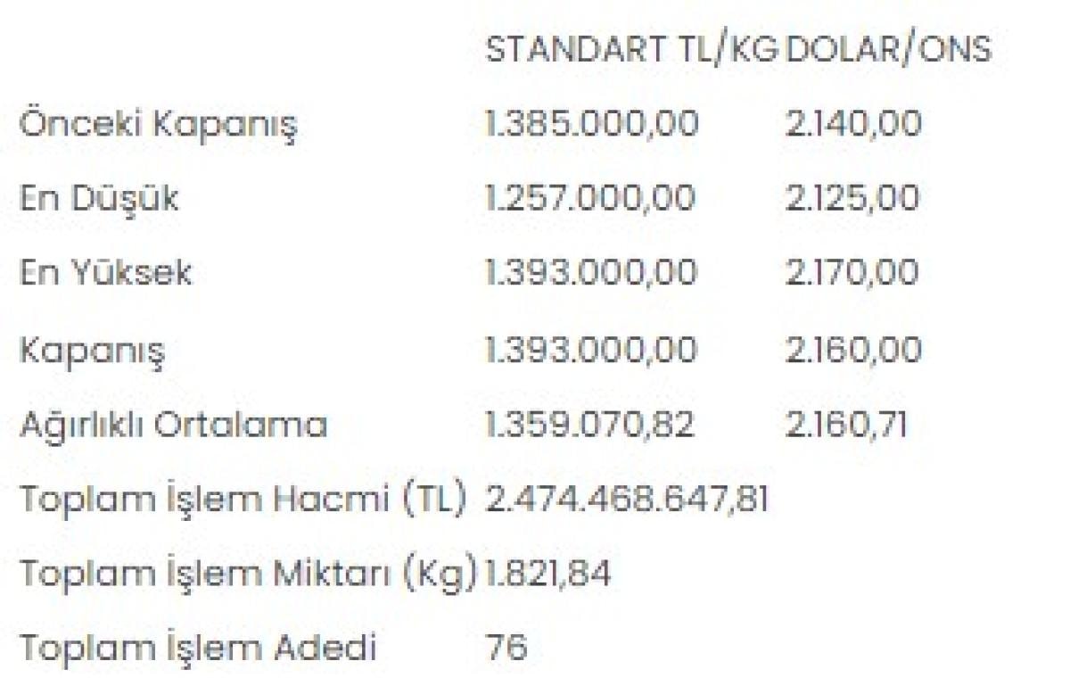 KMKTP'de, altında gerçekleşen toplam işlem hacmi 2 milyar 474 milyon 468 bin 647,81 lira, işlem miktarı ise 1.821,84 kilogram oldu.